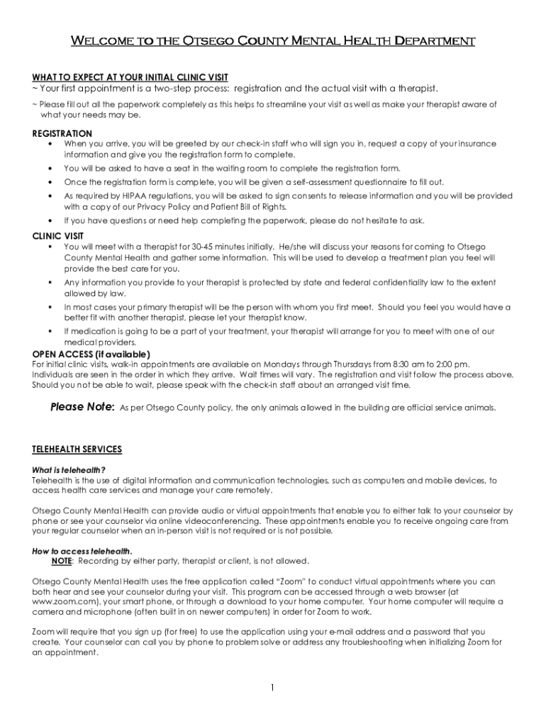 Welcome to the Oswego County Mental Health Department WHAT TO EXPECT AT YOUR INITIAL CLINIC VISIT Your first appointment is a two step process: registration and the actual visit with a therapist.