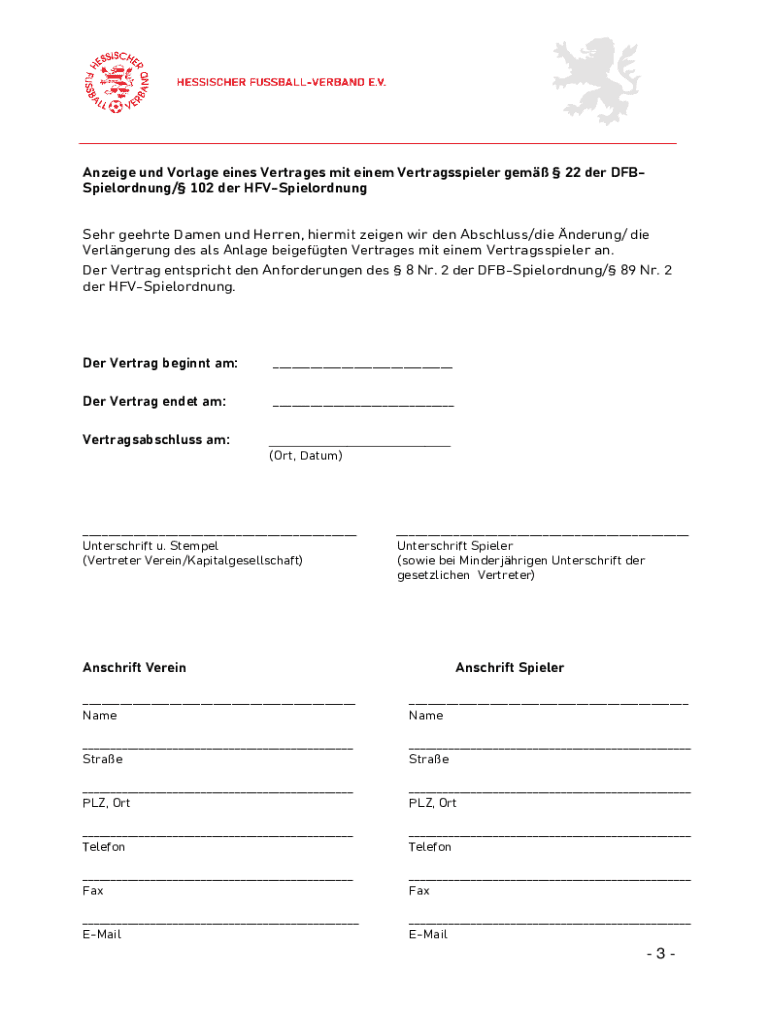 MUSTERVERTRAG FR VERTRAGSSPIELER (STAND 03/2023)Der Mustervertrag fr Vertragsspieler richtet sich in erster Linie an Spieler einer DFBSpielklasse. Daher wird darauf hingewiesen, dass der Vertrag bei