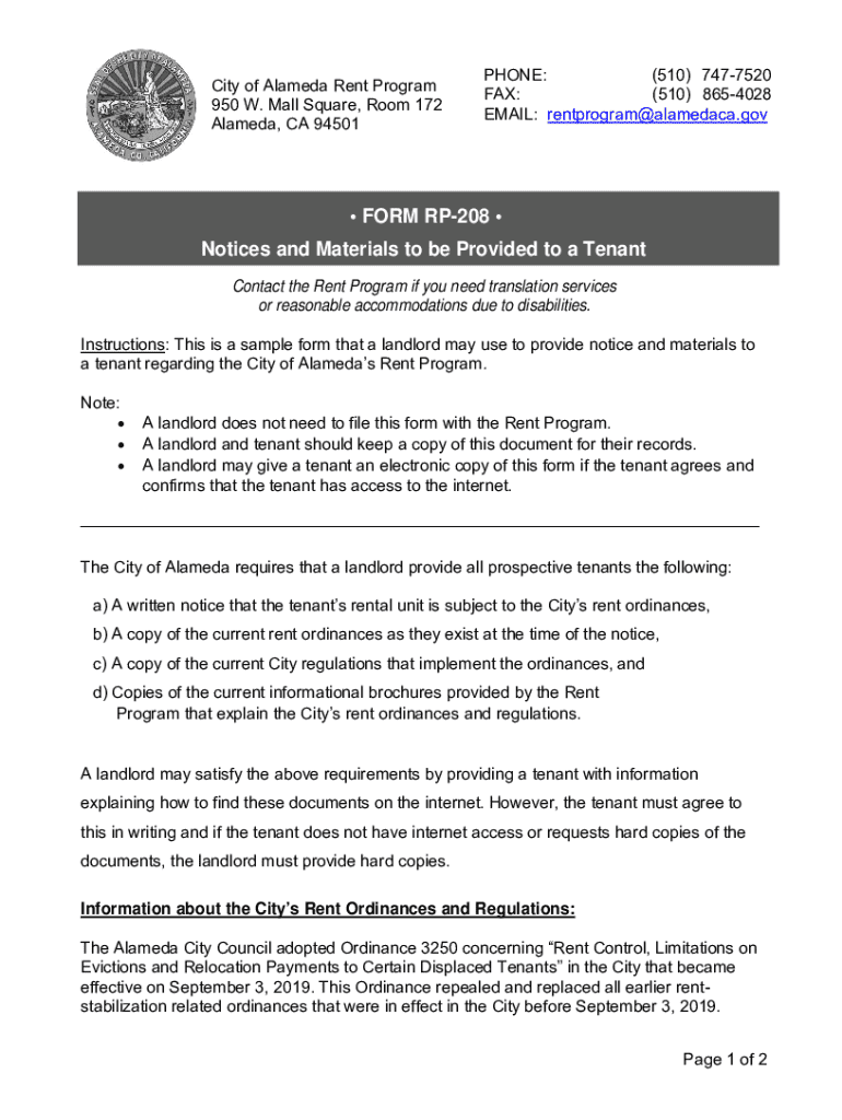 City of Alameda Rent Program 950 W. Mall Square, Room 172 Alameda, CA 94501PHONE: (510) 7477520 FAX: (510) 8654028 EMAIL: rentprogram@alamedaca.gov FORM RP208 Notices and Materials to be Provided