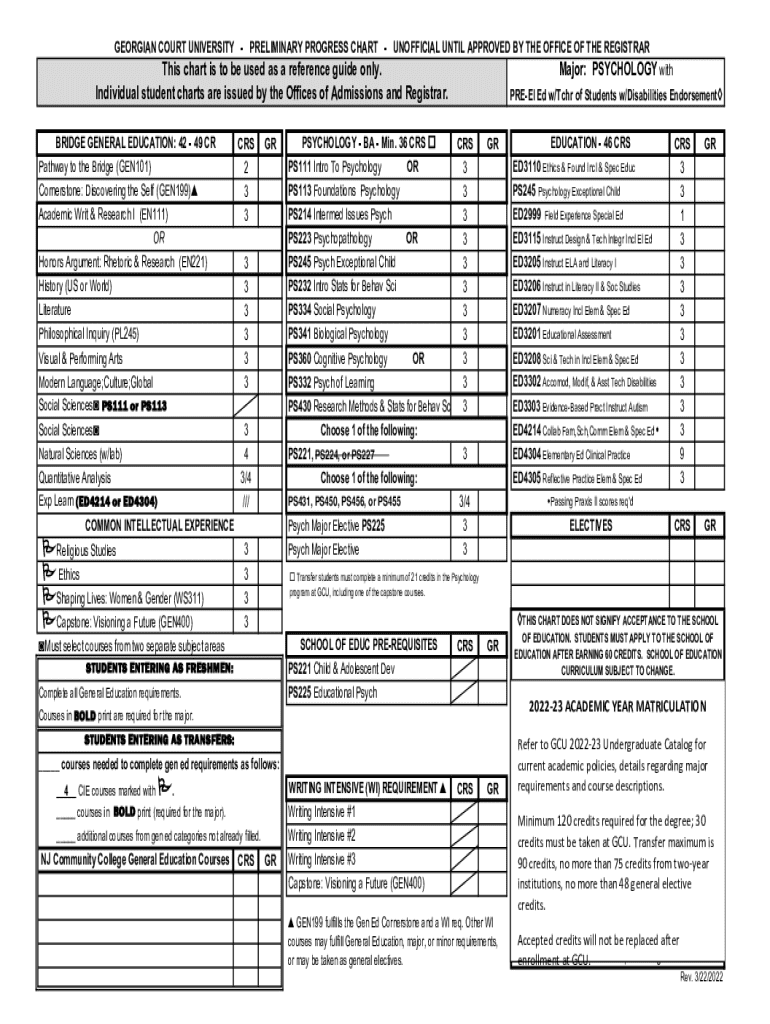 GEORGIAN COURT UNIVERSITY PRELIMINARY PROGRESS CHART UNOFFICIAL UNTIL APPROVED BY THE OFFICE OF THE REGISTRARThis chart is to be used as a reference guide only. Individual student charts are issued