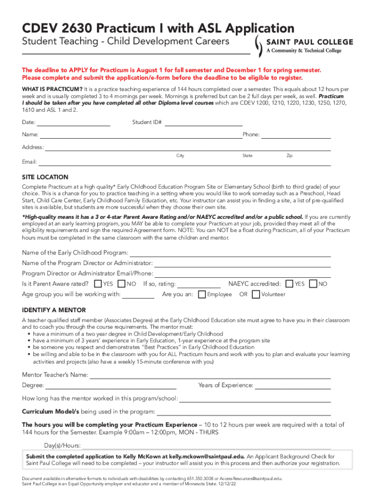 Student Teaching Child Development Careers deadline to APPLY for Practicum is August 1 for fall semester and December 1 for spring semester.