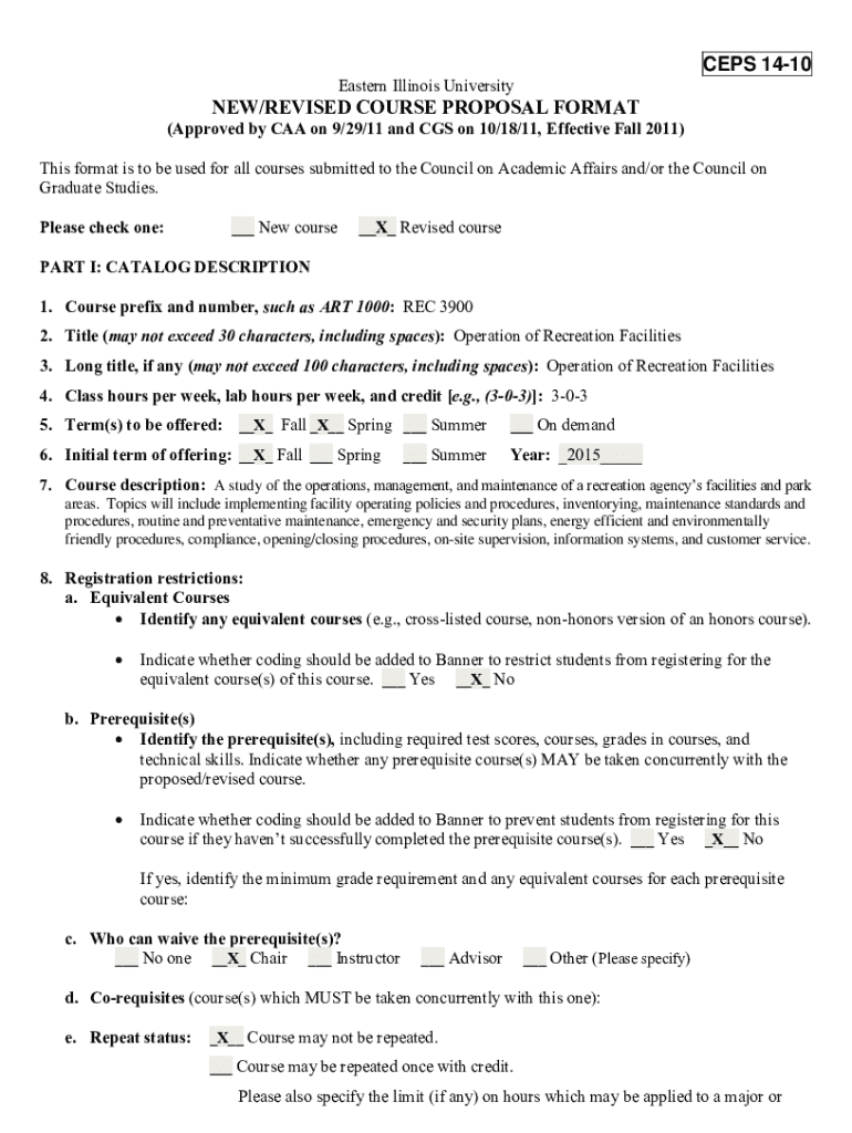 CEPS 1410 Eastern Illinois University/REVISED COURSE PROPOSAL FORMAT (Approved by CAA on 9/29/11 and CGS on 10/18/11, Effective Fall 2011) This format is to be used for all courses submitted to the