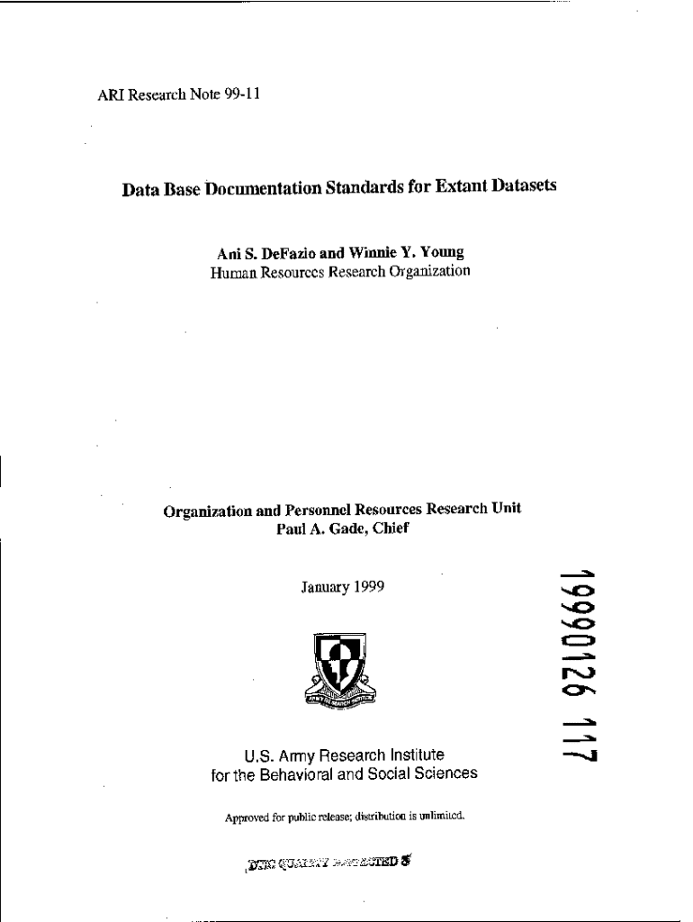 ARI Research Note 9911Data Base Documentation Standards for Extant DatasetsAni S. DeFazio and Winnie Y. Young Human Resources Research OrganizationOrganization and Personnel Resources Research Unit