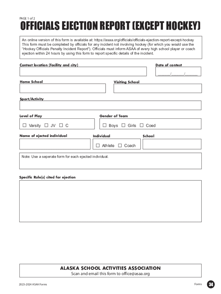 PAGE 1 of 2OFFICIALS EJECTION REPORT (EXCEPT HOCKEY) An online version of this form is available at: https://asaa.org/officials/officialsejectionreportexcepthockey This form must be completed by officials