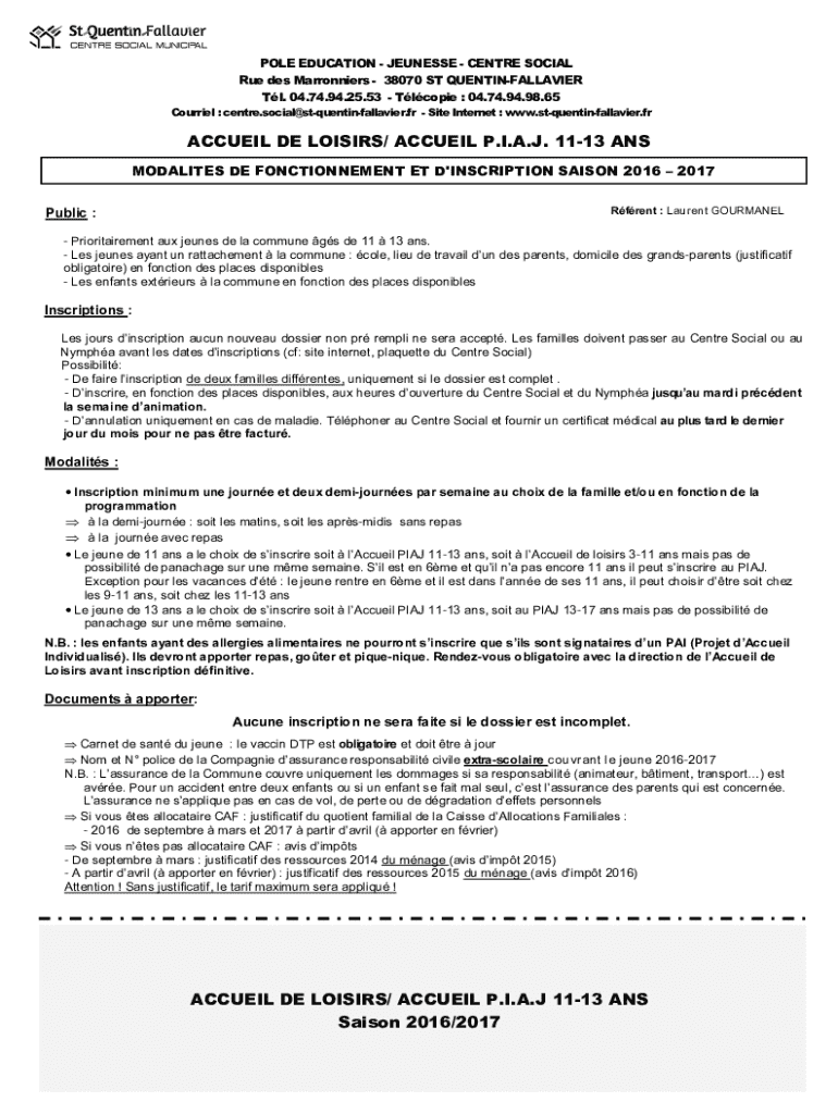POLE EDUCATION JEUNESSE CENTRE SOCIAL Rue des Marronniers 38070 ST QUENTINFALLAVIER Tl. 04.74.94.25.53 Tlcopie : 04.74.94.98.65 Courriel : centre.social@stquentinfallavier.fr Site Internet : www.stquentinfallavier.frACCUEIL