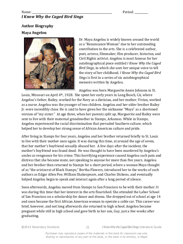 Name:___Period:___IKnowWhytheCagedBirdSingsAuthorBiographyMayaAngelouDr.MayaAngelouiswidelyknownaroundtheworld asaRenaissanceWomanduetoheroutstanding contributiontothearts.Sheisacelebratedauthor,