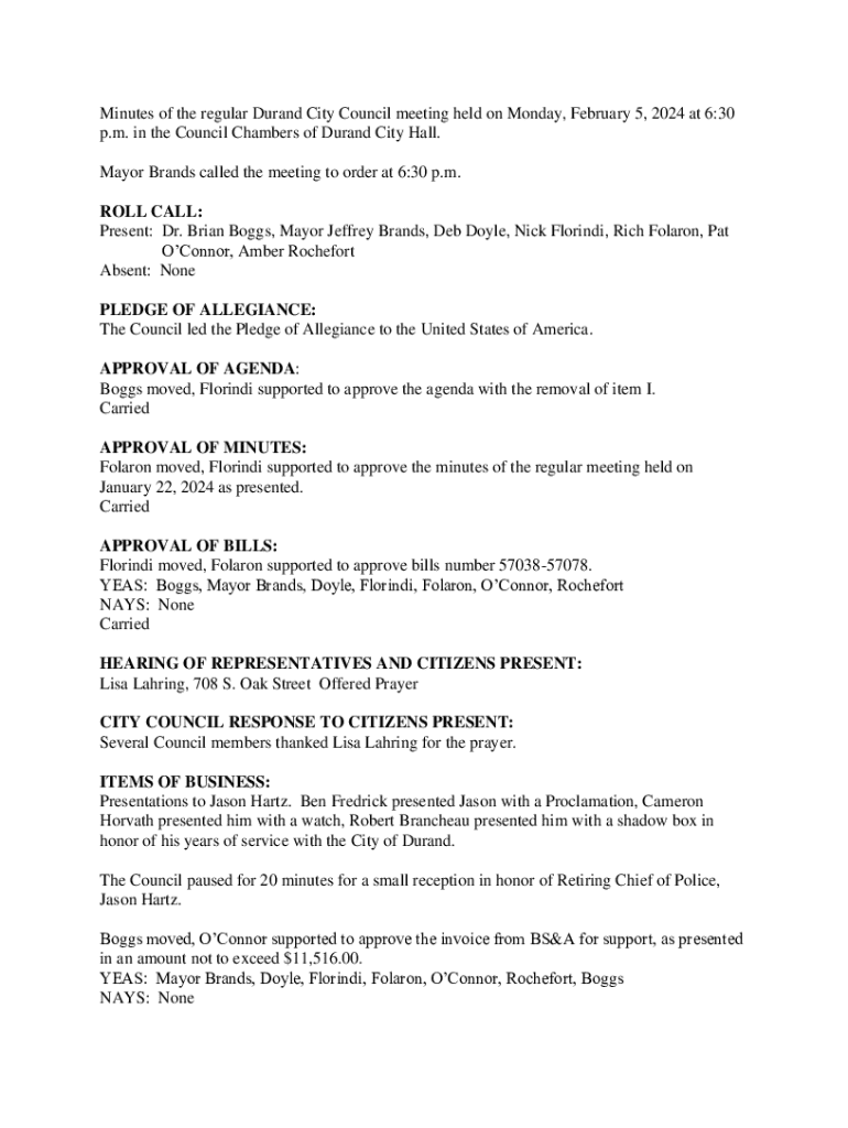 Minutes of the regular Durand City Council meeting held on Monday, February 5, 2024, at 6:30