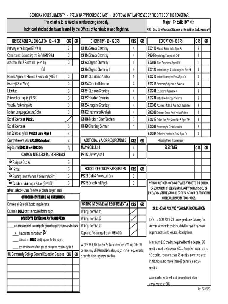 GEORGIAN COURT UNIVERSITY PRELIMINARY PROGRESS CHART UNOFFICIAL UNTIL APPROVED BY THE OFFICE OF THE Registrants chart is to be used as a reference guide only. Individual student charts are issued