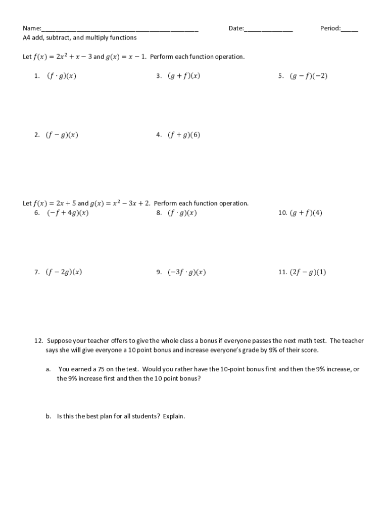 Name:___ A4 add, subtract, and multiply functionsDate:___Period:___Let () 2 2 + 3 and () 1. Perform each function operation. ( )()3. ( + )()2. ( )()4. ( + )(6)1.Let () 2 + 5 and () 2 3 + 2. Perform