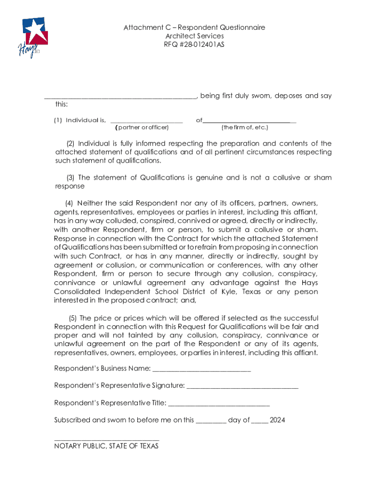Attachment C Respondent Questionnaire Architect Services RFQ #28012401AS___, being first duly sworn, deposes and say this: (1) Individual is, ___ (partner or officer)of_ (the firm of, etc.)(2) Individual