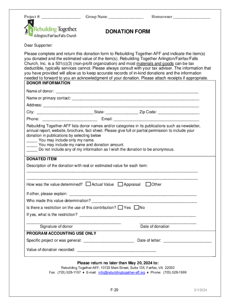 Project #: ___Group Name ___Homeowner ___DONATION FORM Dear Supporter:Please complete and return this donation form to Rebuilding TogetherAFF and indicate the item(s) you donated and the estimated