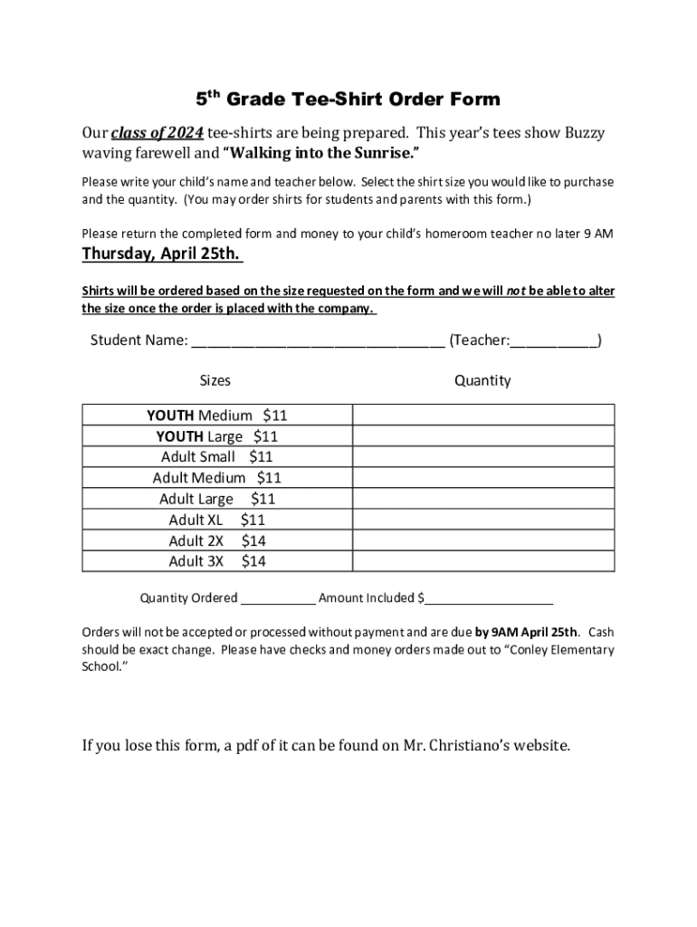 5th Grade Shirt Order Form