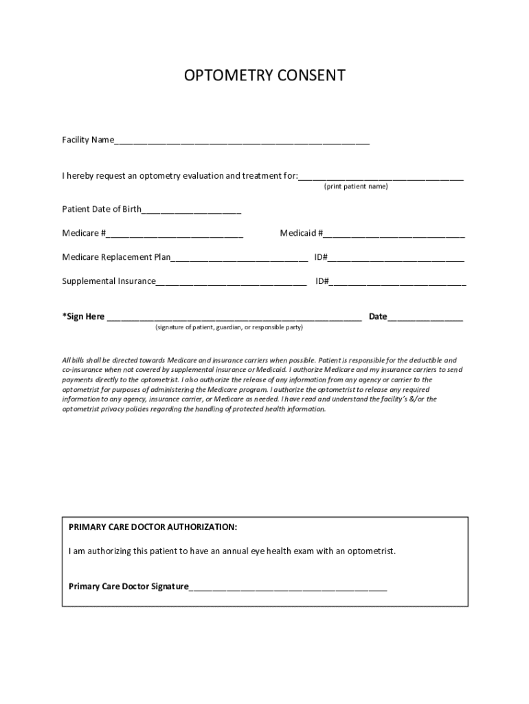 OPTOMETRY CONSENTFacility Name___I hereby request an optometry evaluation and treatment for:___ (print patient name)Patient Date of Birth___ Medicare #___Medicaid #___Medicare Replacement Plan___