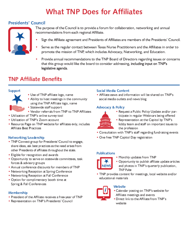 What TNP Does for Affiliates Presidents Council The purpose of the Council is to provide a forum for collaboration, networking and annual recommendations from each regional Affiliate. Sign the Affiliate