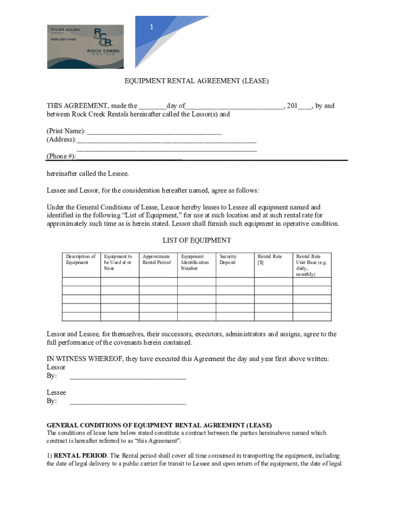1EQUIPMENT RENTAL AGREEMENT (LEASE) THIS AGREEMENT, made the ___day of___, 201___, by and between Rock Creek Rentals hereinafter called the Lessor(s) and (Print Name): ___ (Address):___ ___ (Phone