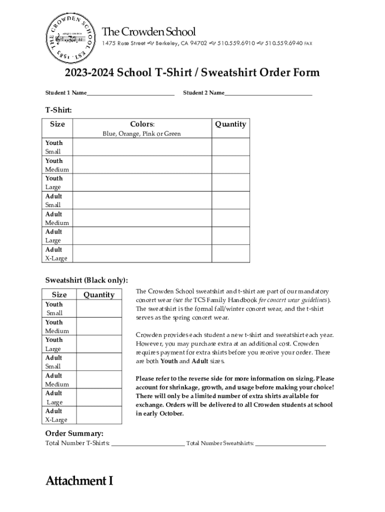 1475 Rose Street Berkeley, CA 94702 510.559.6910 510.559.6940 FAX20232024 School Shirt / Sweatshirt Order Form