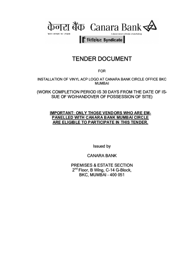 TENDER DOCUMENT FOR INSTALLATION OF VINYL ACP LOGO AT CANADA BANK CIRCLE OFFICE BKC MUMBAI(WORK COMPLETION PERIOD IS 30 DAYS FROM THE DATE OF ISSUE OF TO/HANDOVER OF POSSESSION OF SITE)IMPORTANT: