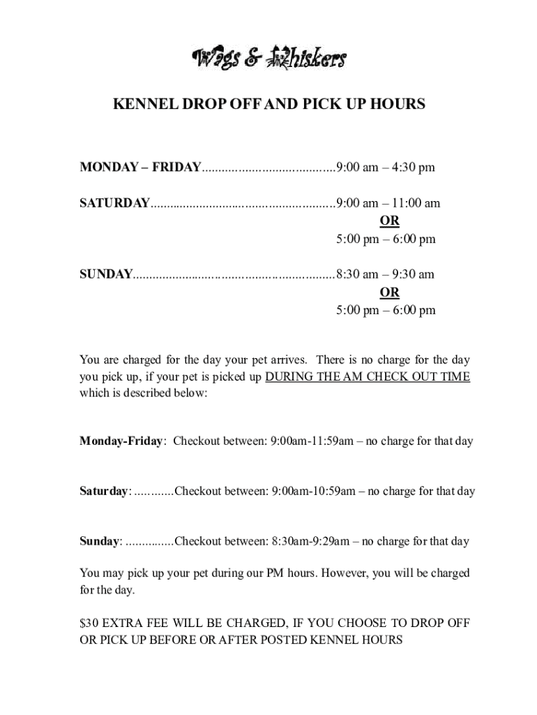 KENNEL DROP OFF AND PICK UP HOURSMONDAY FRIDAY........................................9:00 am 4:30 pm