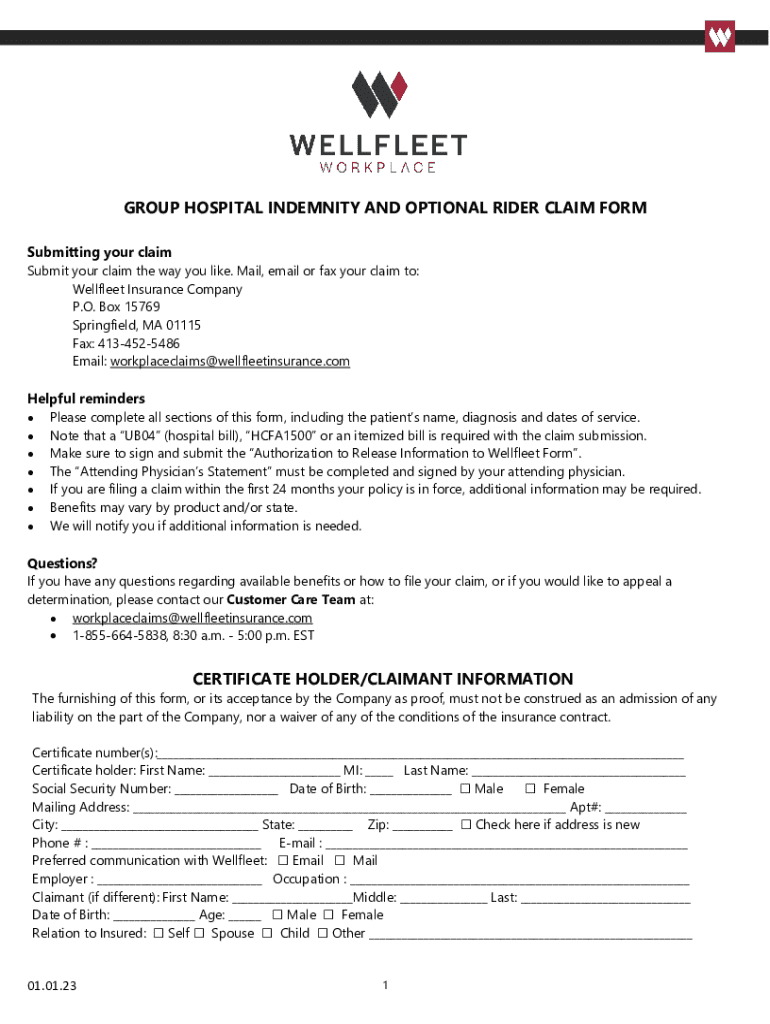 GROUP HOSPITAL INDEMNITY AND OPTIONAL RIDER CLAIM FORM Submitting your claim Submit your claim the way you like. Mail, email or fax your claim to: Well fleet Insurance Company P.O. Box 15769 Springfield,