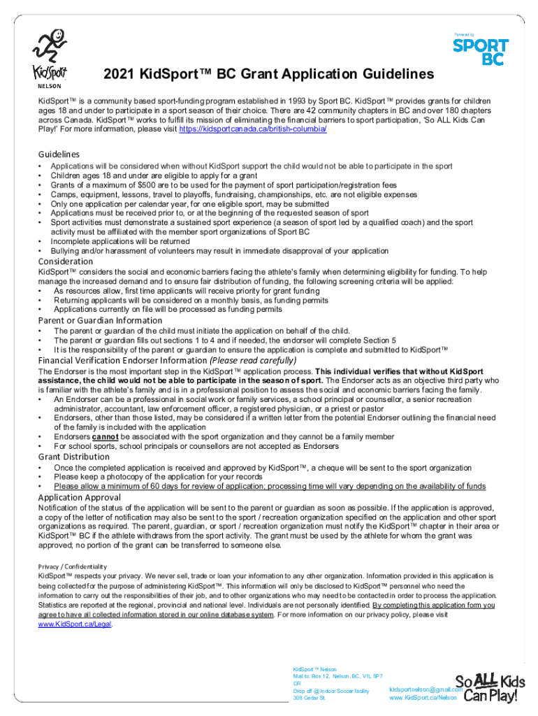 2021 KidSport BC Grant Application Guidelines KidSport is a community based sportfunding program established in 1993 by Sport BC. KidSport provides grants for children ages 18 and under to participate