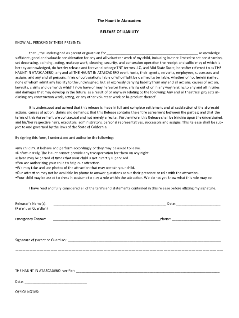 The Haunt in Atascadero RELEASE OF LIABILITY KNOW ALL PERSONS BY THESE PRESENTS: that I, the undersigned as parent or guardian for ___ acknowledge sufficient, good and valuable consideration for any