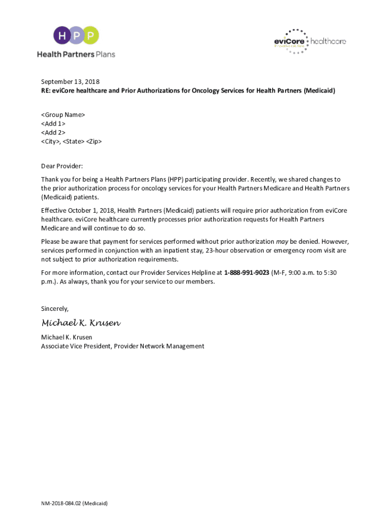 RE: encore healthcare and Prior Authorizations for Oncology Services for Health Partners (Medicaid)