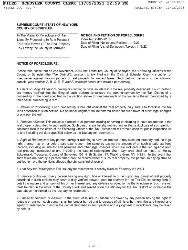 INDEX NO. e20220132FILED: SCHUYLER COUNTY CLERK 11/02/2023 12:59 PM NYSCEF DOC. NO. 7SUPREME COURT: STATE OF NEW YORK COUNTY OF SCHUYLER ___ In The Matter Of Foreclosure Of Tax Liens By Proceeding