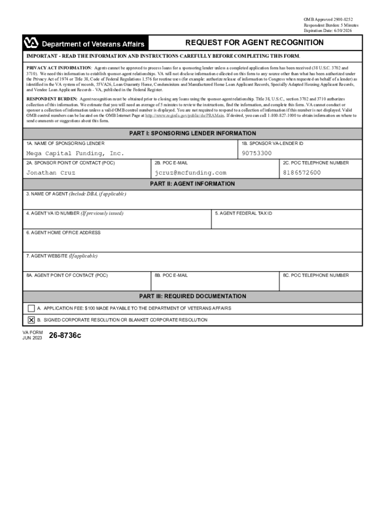 VA AUTHORIZED AGENT SPONSORSHIP RENEWAL Forms form is to be used for requesting approval to be a VA authorized agent for Mega Capital Funding or for