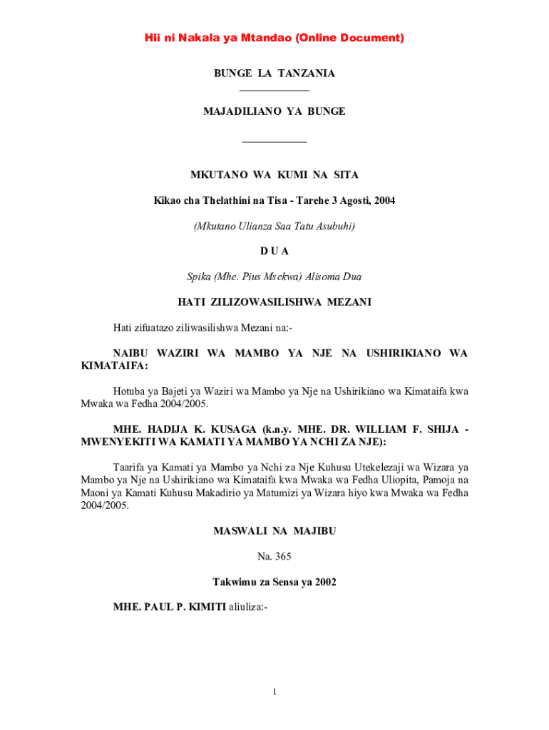 Get the free bunge la 12 mkutano wa kumi na tano kikao cha k... - parliament go