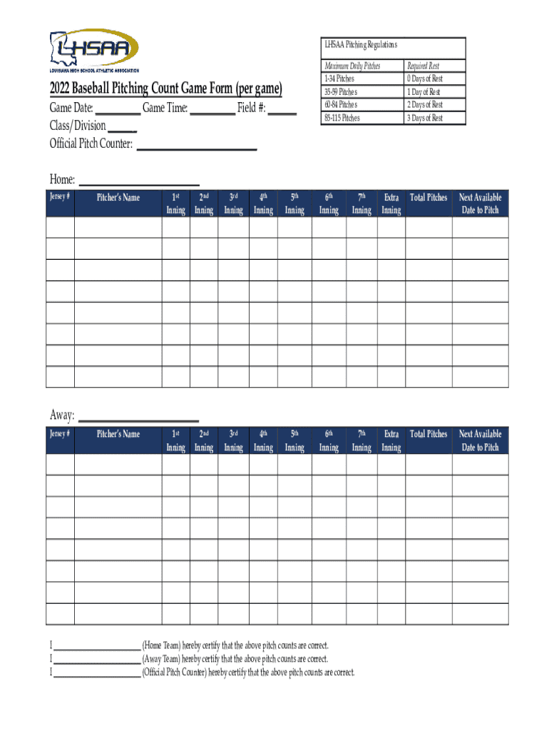 To fill out the baseball pitching count game, one must record the total number of pitches thrown by each pitcher during the game and submit this information on the appropriate form or online portal as designated by the governing body.