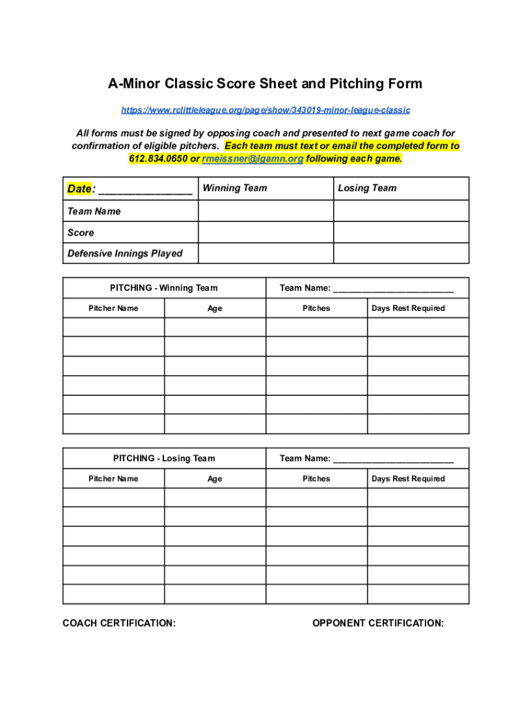 Get the free A-Minor Classic Score Sheet and Pitching Form