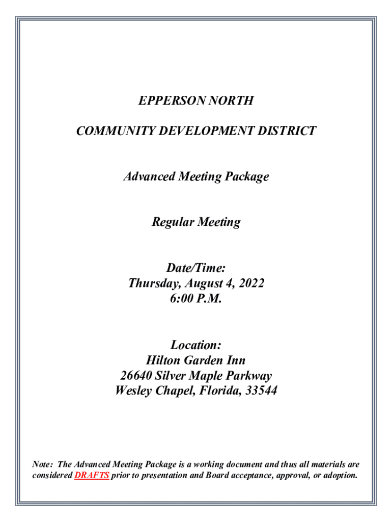 PERSON NORTH COMMUNITY DEVELOPMENT DISTRICT Advanced Meeting Package Regular Meeting Date/Time: Thursday, August 4, 2022 6:00 P.M. Location: Hilton Garden Inn 26640 Silver Maple Parkway Wesley Chapel,