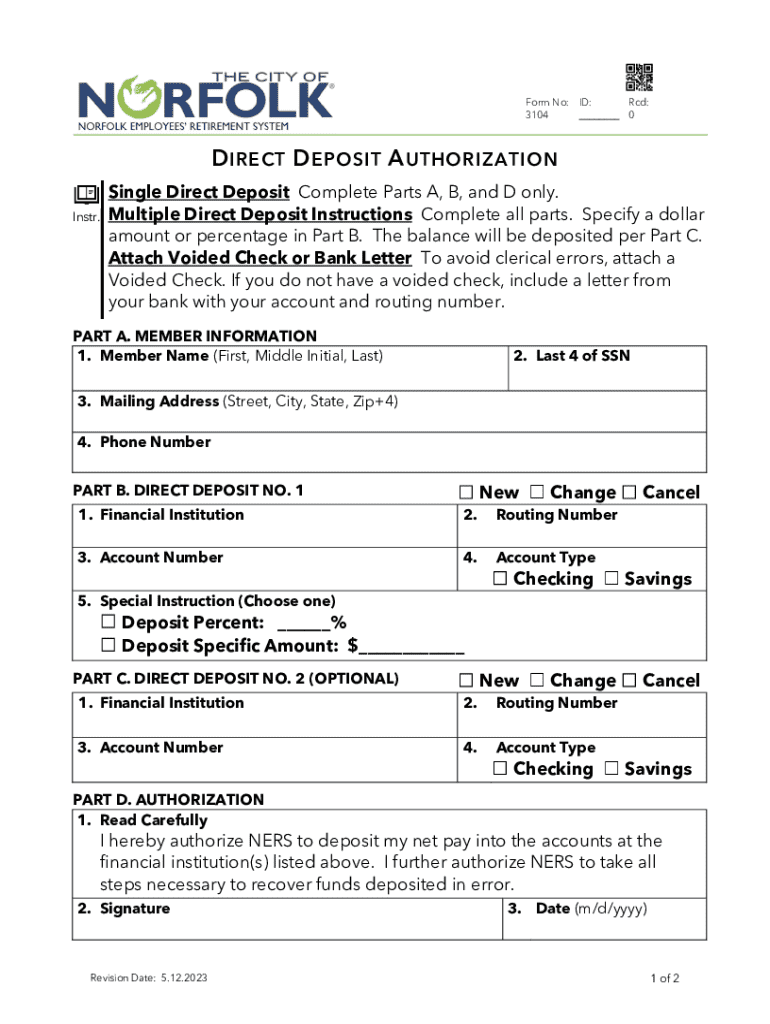 Form No: ID: RCD: 3104 ___ 0D DIRECT D DEPOSIT A AUTHORIZATION Instr. Single Direct Deposit Complete Parts A, B, and D only. Multiple Direct Deposit Instructions Complete all parts. Specify a dollar