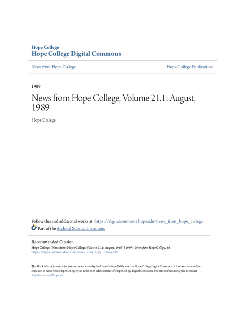 News from Hope College Hope College Publications1989News from Hope College, Volume 21.1: August 1989