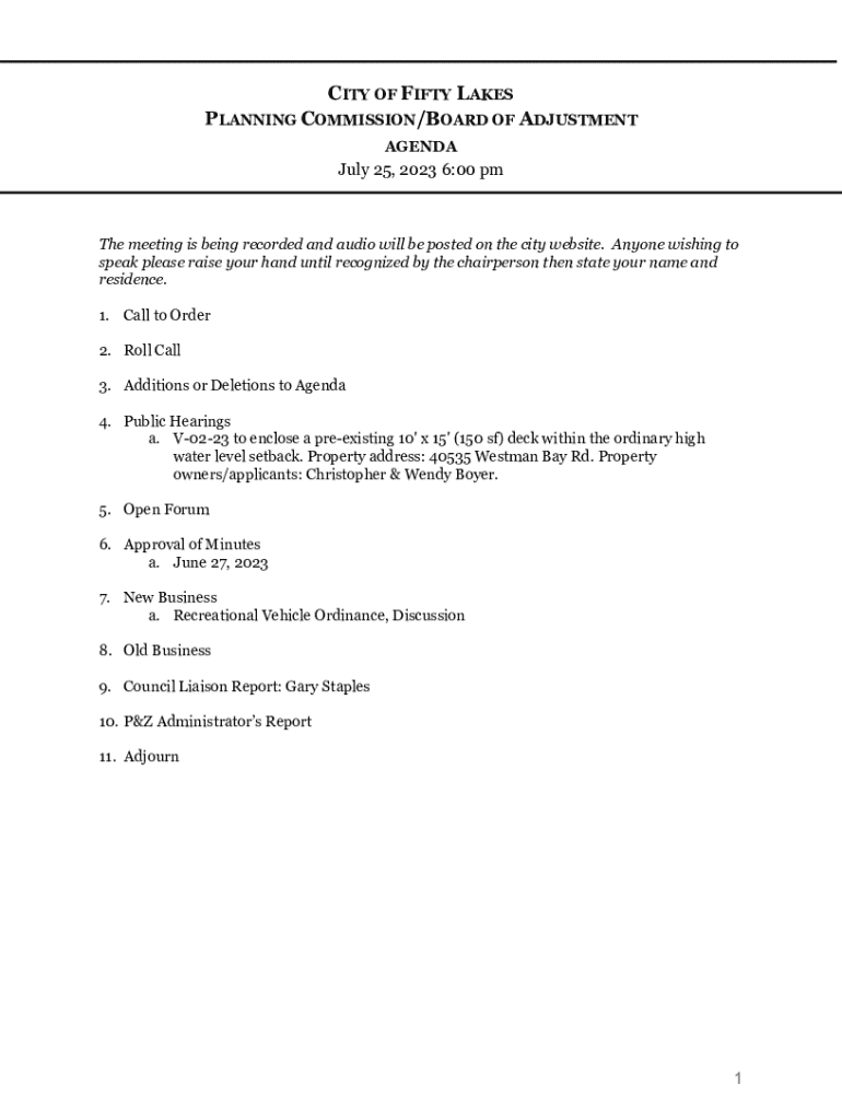 CITY OF FIFTY LAKES PLANNING COMMISSION/BOARD OF ADJUSTMENT AGENDAJuly 25, 2023 6:00 pmThe meeting is being recorded and audio will be posted on the city website. Anyone wishing to speak please raise