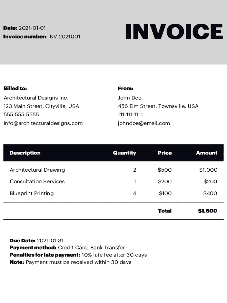 Invoice number: INV2021001INVOICEBilled to:From:Architectural Designs Inc. John Doe123 Main Street, Amityville, USA456 Elm Street, Townsville, USA55555555551111111111info@architecturaldesigns.comjohndoe@email.comDescriptionQuantityPriceAmountArchitectural