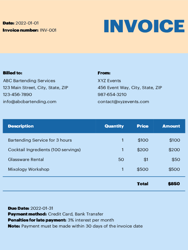 Invoice number: INV001INVOICEBilled to:From:ABC Bartending Services XYZ Events123 Main Street, City, State, ZIP456 Event Way, City, State, ZIP12345678909876543210info@abcbartending.comcontact@xyzevents.comDescriptionQuantityPriceAmountBartending