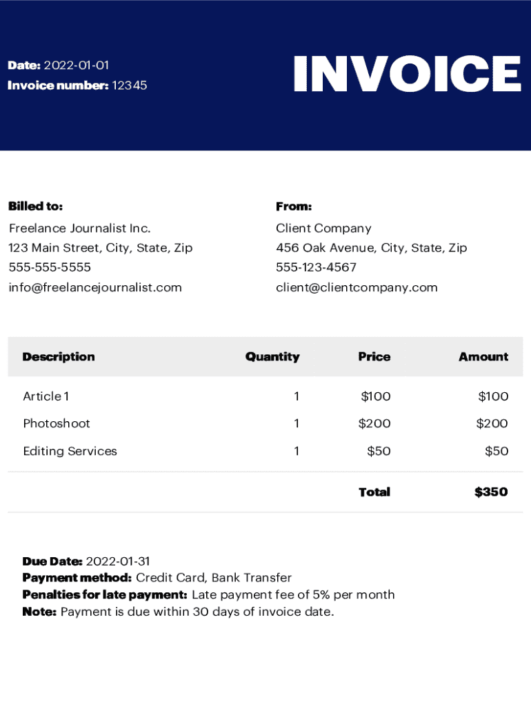 Invoice number: 12345INVOICEBilled to:From:Freelance Journalist Inc.Client Company123 Main Street, City, State, Zip456 Oak Avenue, City, State, Zip55555555555551234567info@freelancejournalist.comclient@clientcompany.comDescriptionQuantityPriceAmountArticle