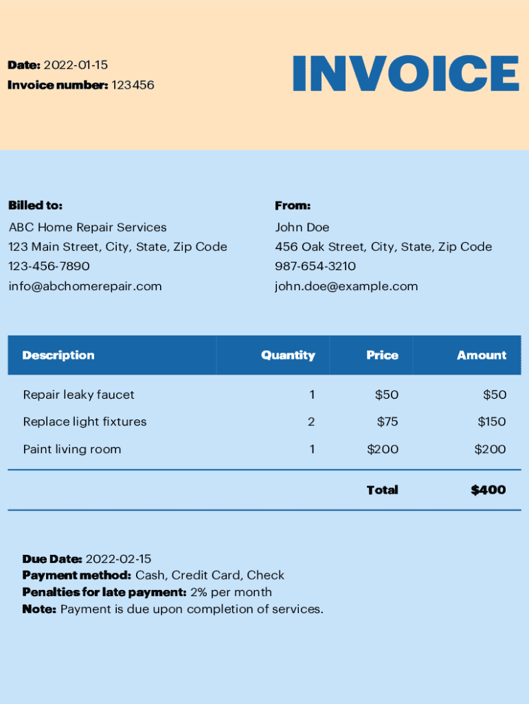 Invoice number: 123456INVOICEBilled to:From:ABC Home Repair Services John Doe123 Main Street, City, State, Zip Code456 Oak Street, City, State, Zip Code12345678909876543210info@abchomerepair.comjohn.doe@example.comDescriptionQuantityPriceAmountRepair