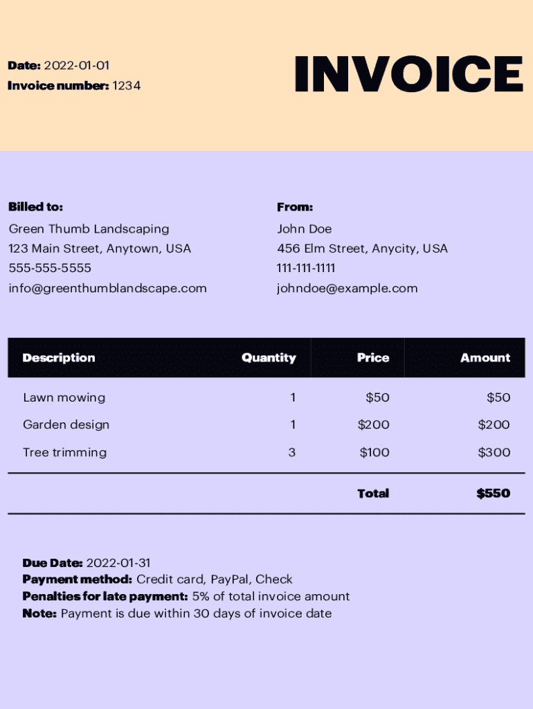 Invoice number: 1234INVOICEBilled to:From:Green Thumb Landscaping John Doe123 Main Street, Any town, USA456 Elm Street, Any city, USA55555555551111111111info@greenthumblandscape.comjohndoe@example.comDescriptionQuantityPriceAmountLaw$1mowing1$50$50Garde$1design1$200$200Tree