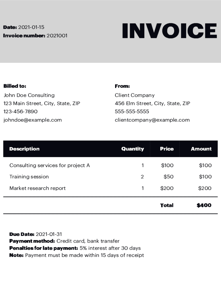 Invoice number: 2021001INVOICEBilled to:From:John Doe ConsultingClient Company123 Main Street, City, State, ZIP456 Elm Street, City, State, ZIP12345678905555555555johndoe@example.comclientcompany@example.comDescriptionQuantityPriceAmountConsulting