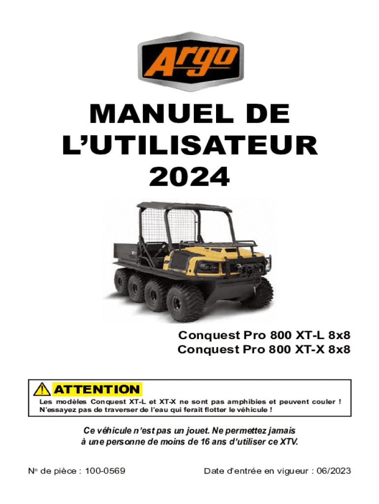 Tous les particuliers ou entreprises qui possèdent ou exploitent un Argo Conquest Pro Outfitter doivent le déclarer selon les réglementations en vigueur.