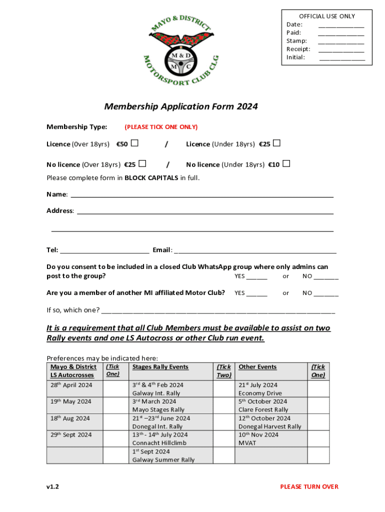 OFFICIAL USE ONLY Date: ___ Paid: ___ Stamp: ___ Receipt: ___ Initial: ___Membership Application Form 2024 Membership Type:(PLEASE TICK ONE ONLY) No license (Over 18yrs) 25 License (0ver 18yrs) 50/License