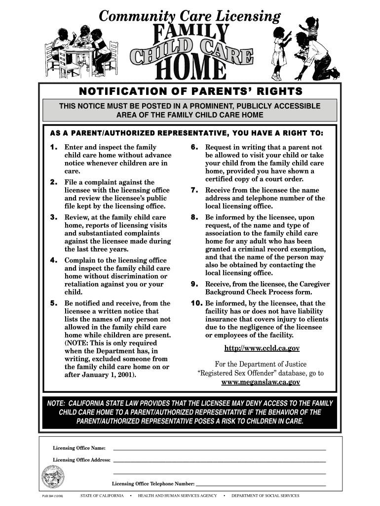 Community Care Licensing NOTIFICATION O F PARENTS RIGHTS THIS NOTICE MUST BE POSTED IN A PROMINENT, PUBLICLY ACCESSIBLE AREA OF THE FAMILY CHILD CARE HOME A S A PARENT/AUTHORIZED REPRESENTATIVE, YOU