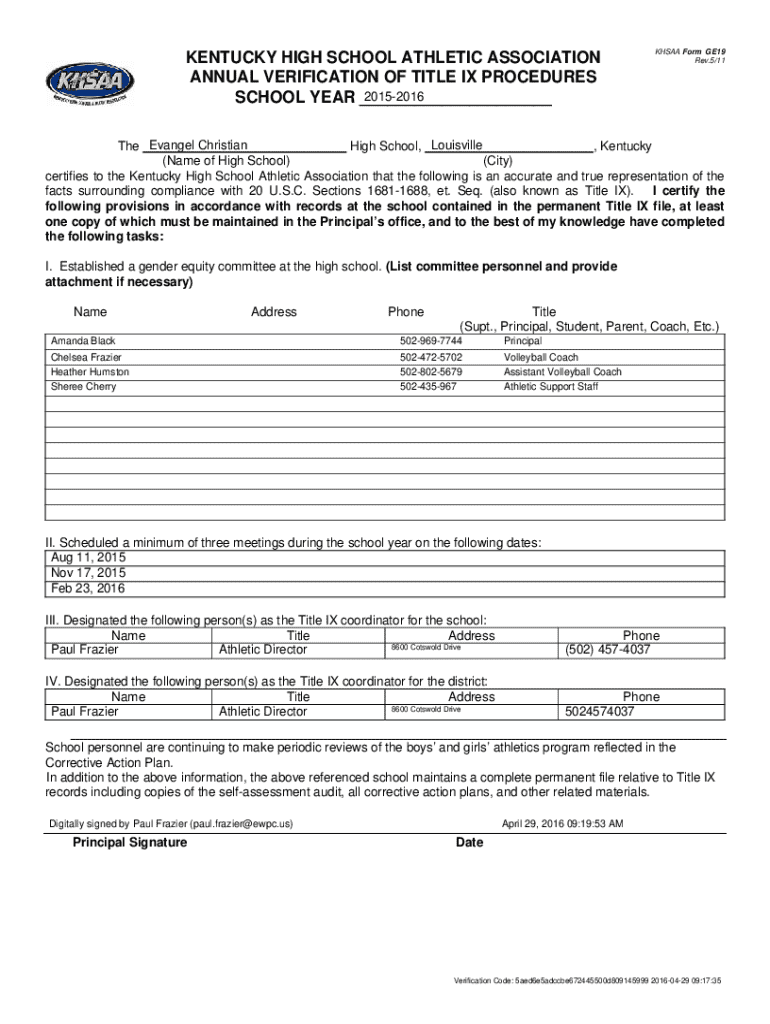 KENTUCKY HIGH SCHOOL ATHLETIC ASSOCIATION ANNUAL VERIFICATION OF TITLE IX PROCEDURES 20152016 SCHOOL YEAR ___KHS AA Form GE19 Rev.5/11Evangel Christian Louisville The ___ High School, ___, Kentucky