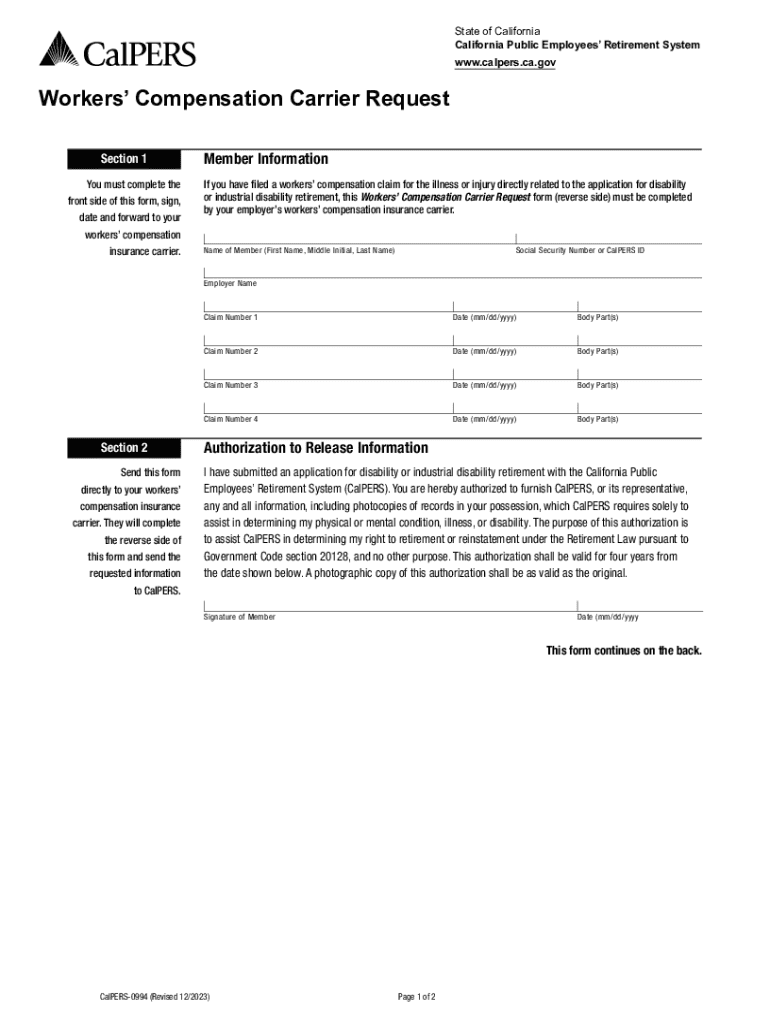Get the free Workers' Compensation Carrier Request Form (CalPERS-0994) (PDF). CalPERS Forms