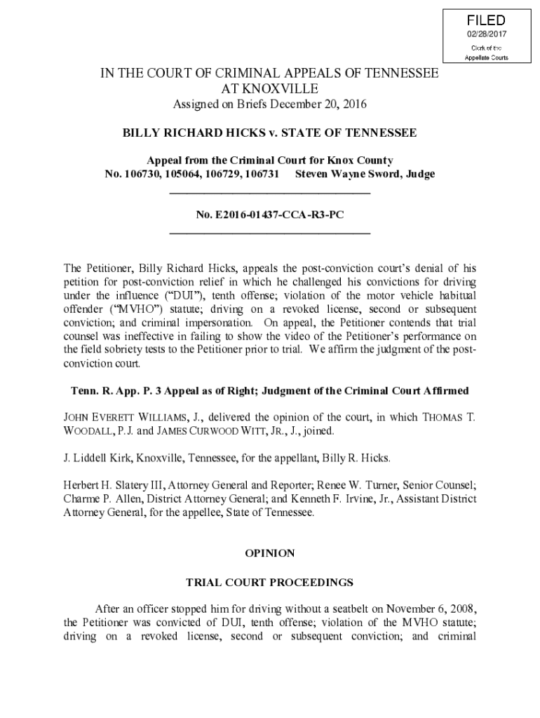02/28/2017IN THE COURT OF CRIMINAL APPEALS OF TENNESSEE AT KNOXVILLE Assigned on Briefs December 20, 2016 BILLY RICHARD HICKS v. STATE OF TENNESSEE Appeal from the Criminal Court for Knox County No.