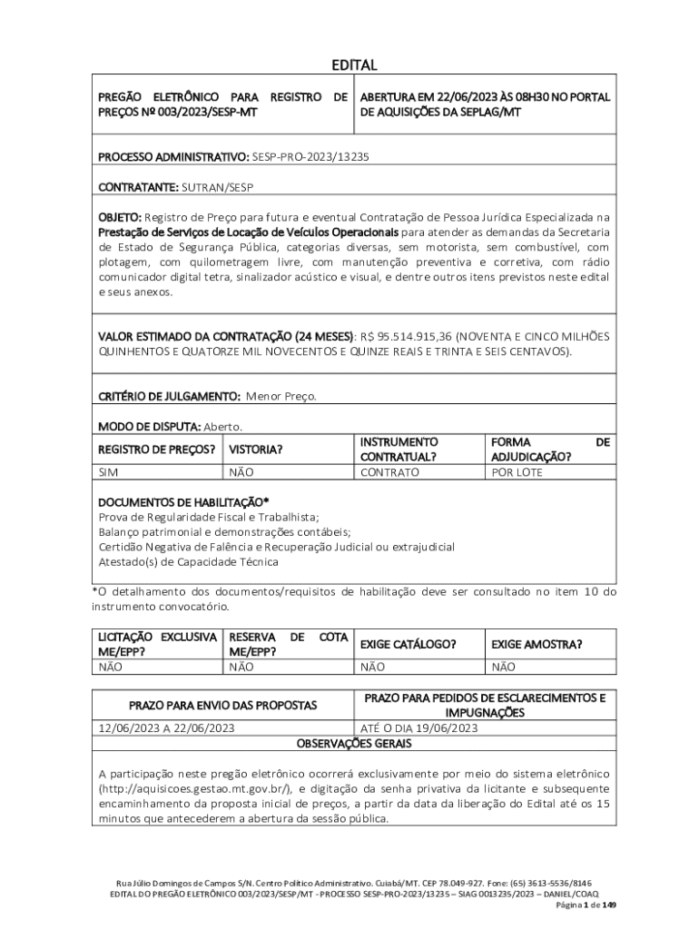 Obtenha o gratuito PREGO ELETRNICO PARA REGISTRO DE ABERTURA EM 22/06/2023 S 08H30 NO PORTAL