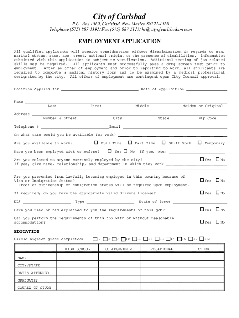 City of Carlsbad P.O. Box 1569, Carlsbad, New Mexico 882211569 Telephone (575) 8871191/ Fax (575) 8875115/ hr@cityofcarlsbadnm.comEMPLOYMENT APPLICATION All qualified applicants will receive consideration