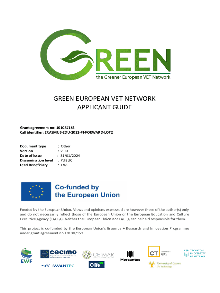 GREEN EUROPEAN VET NETWORK APPLICANT GUIDE Grant agreement no: 101087153 Call identifier: ERASMUSEDU2022PIFORWARDLOT2Document type Version Date of issue Dissemination level Lead Beneficiary: : : :